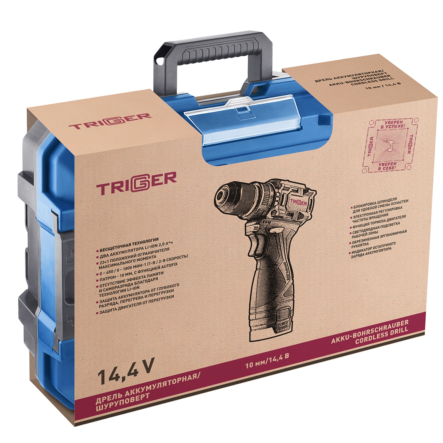 Дрель-шуруповерт Trigger 20130, бесщеточная, 14,4V, 10 мм, 48 Нм, 2 аккумулятора Li-ion (2Ач), кейс