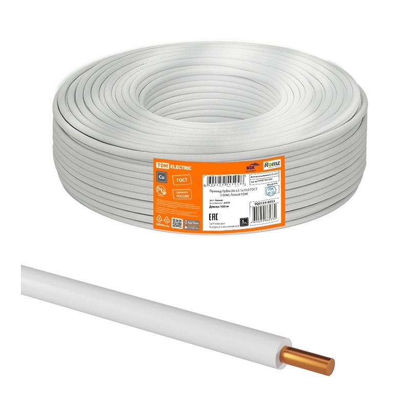 Провод ПуВнг-LS (ПВ-1) 1х10мм2, белый (бухта-100 п.м.) ГОСТ 31947-2012