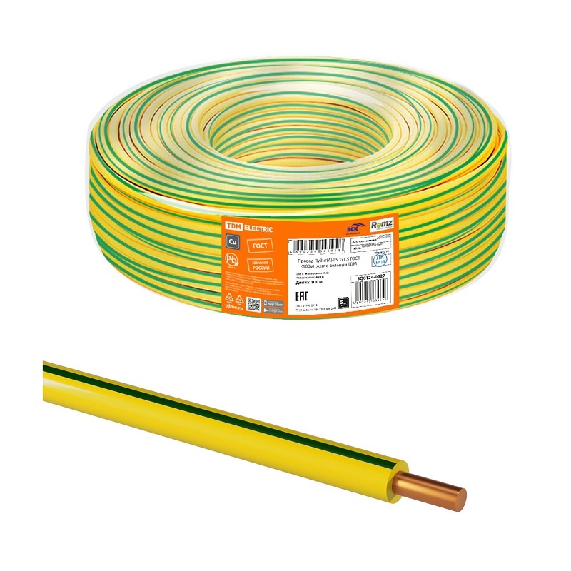 Провод ПуВнг-LS (ПВ-1) 1х1,5мм2, желто-зеленый (бухта-100 п.м.) ГОСТ 31947-2012