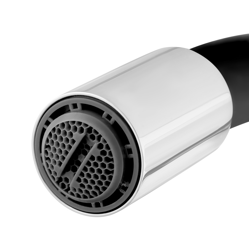 - Чёрный силиконовый излив приятно удивляет своей гибкостью и эластичностью, значительно увеличивая функциональность смесителя.