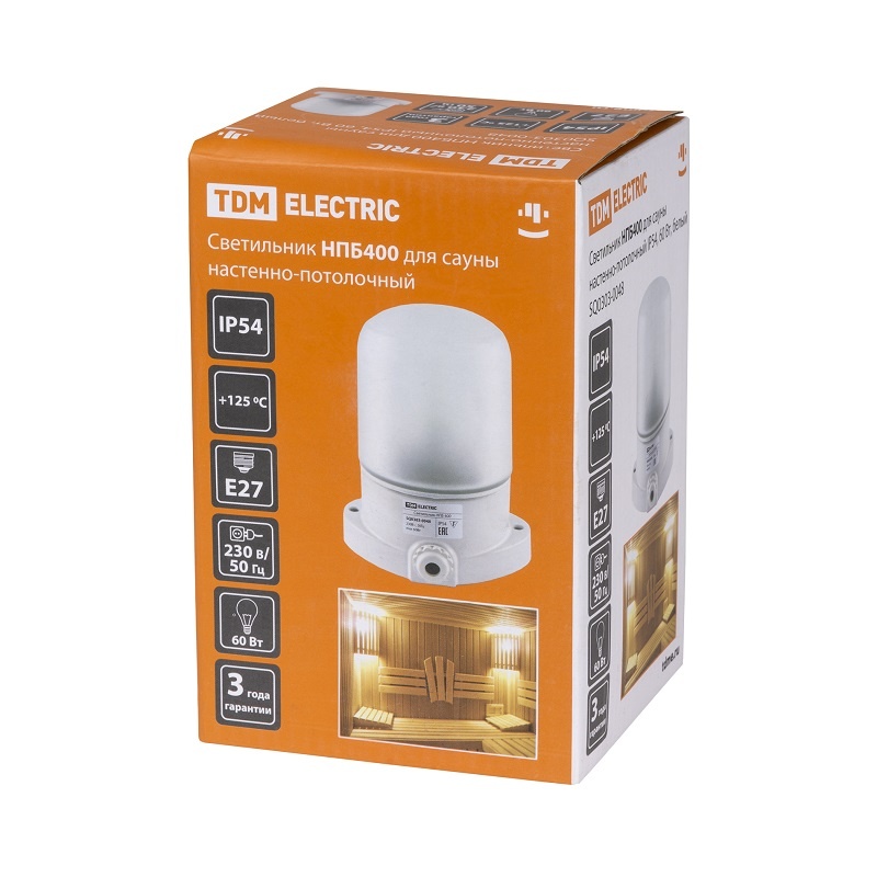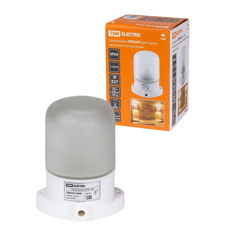 Светильник д/ сауны под E27, 60Вт, 230В, настенный/потолочный, IP54, белый пластик+стекло
